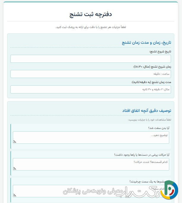 • تاریخ، زمان و مدت زمان تشنج: این اطلاعات به شناسایی الگوها کمک می‌کند.