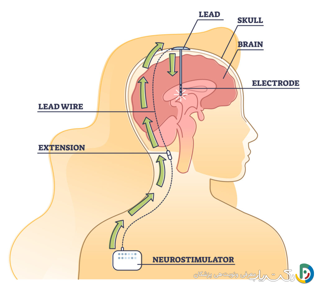 تحریک عمیق مغز (Deep Brain Stimulation – DBS): این روش که به “ضربانساز مغز” نیز معروف است، برای بیمارانی که دچار نوسانات حرکتی شدید یا دیسکینزی غیرقابل کنترل ناشی از داروها شدهاند، در نظر گرفته میشود. در این جراحی، الکترودهای بسیار نازکی در نواحی خاصی از مغز (مانند هسته سابتالامیک) کاشته میشود. این الکترودها به یک دستگاه ضربانساز که در زیر پوست قفسه سینه قرار میگیرد، متصل میشوند. این دستگاه پالسهای الکتریکی مداومی را برای تنظیم سیگنالهای غیرطبیعی مغز ارسال میکند و به این ترتیب به کنترل لرزش، سفتی و کندی حرکات کمک شایانی میکند، اما بر علائم غیرحرکتی تأثیر چندانی ندارد.